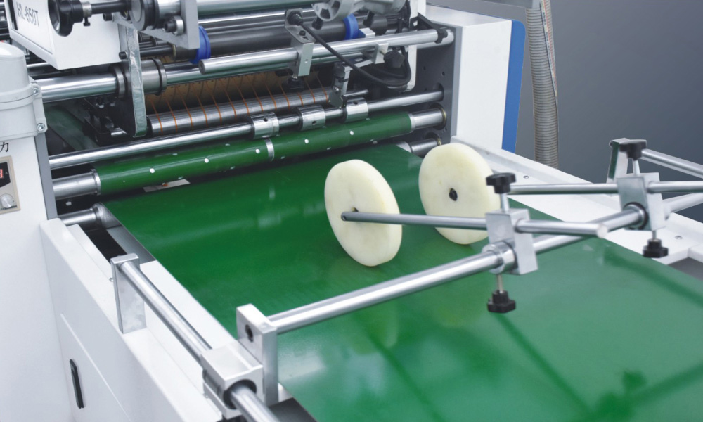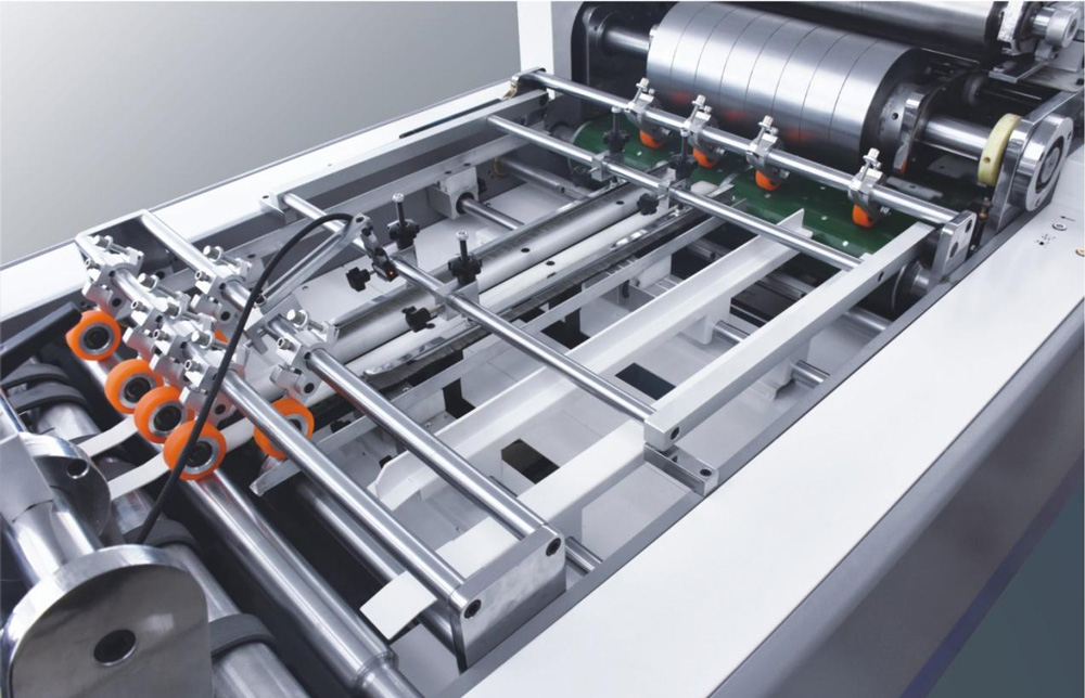 4、涂膠部:涂膠滾筒的橫向于縱向分別由伺服電機驅動,可不停機直接進行雙向調節(jié),涂膠部還具備空張避膠功能,避免膠水接觸到皮帶,減少因為空張而頻繁停機清洗皮帶的麻煩。